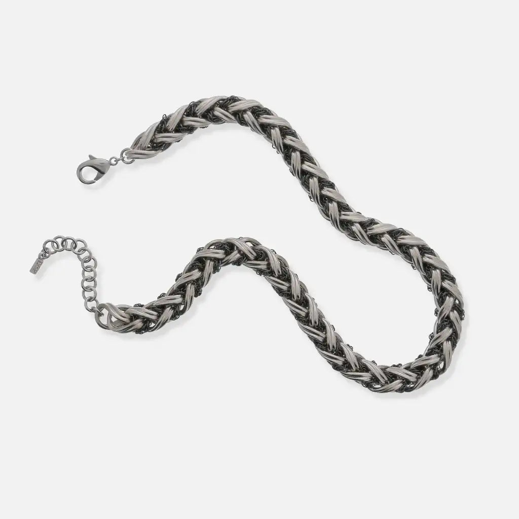 Collier tressé en métal bicolore qui brouille les lignes entre force et raffinement. Une pièce signature DCP, pensée pour celles et ceux qui s’affranchissent des codes.