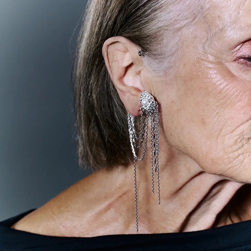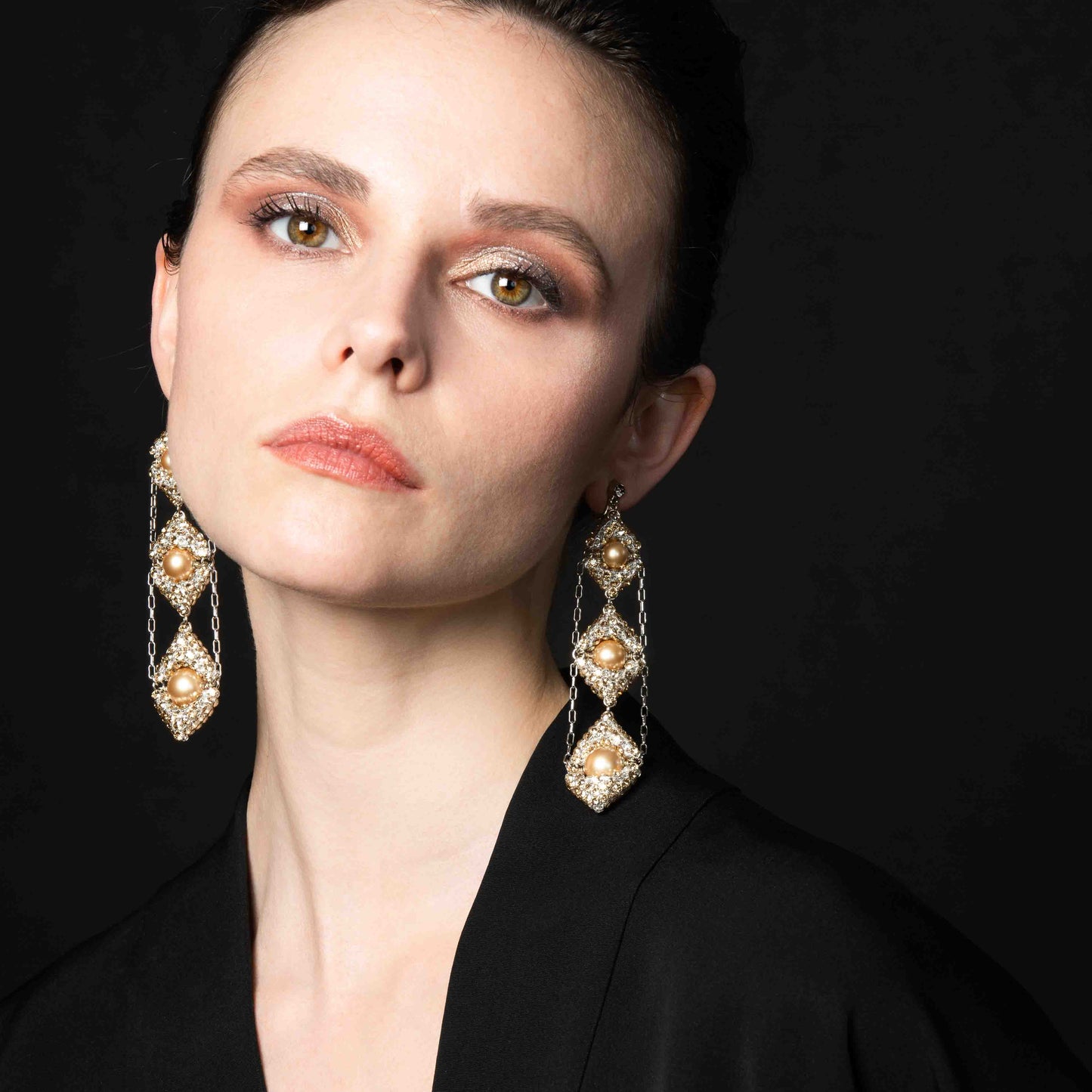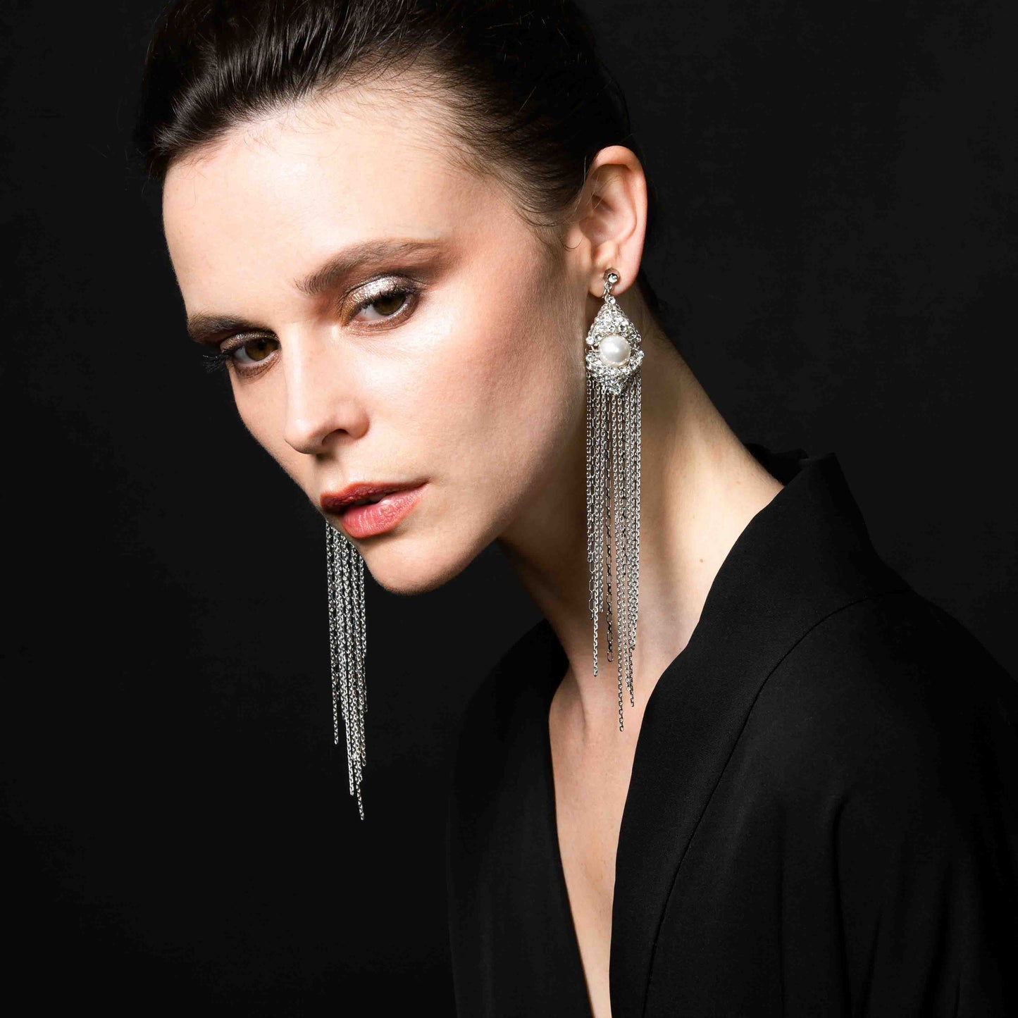 Femme portant les boucles d’oreilles longues pendantes Alex en métal doré, chaînes tressées et strass, associées à la bague perle Noé.