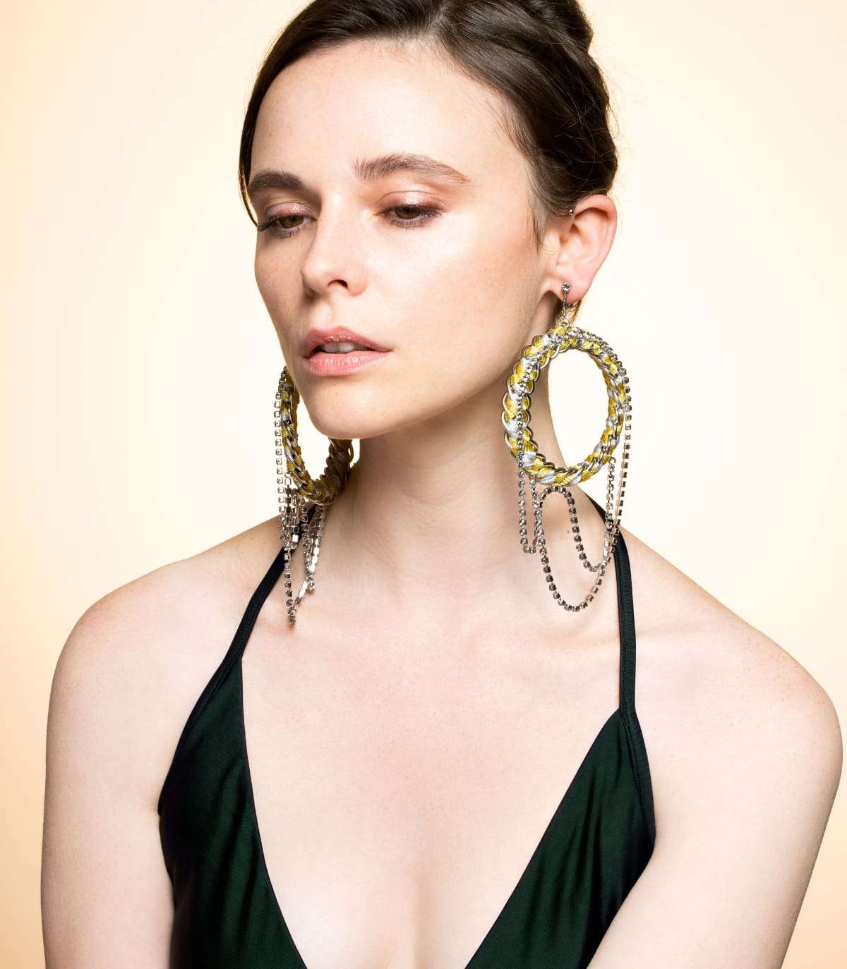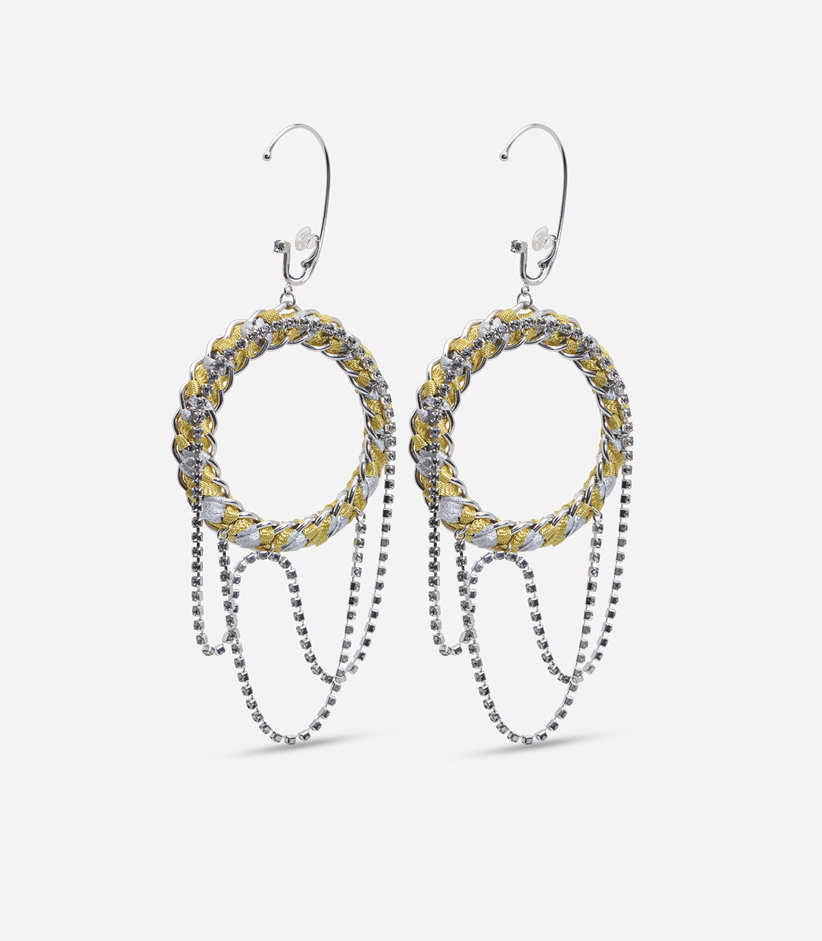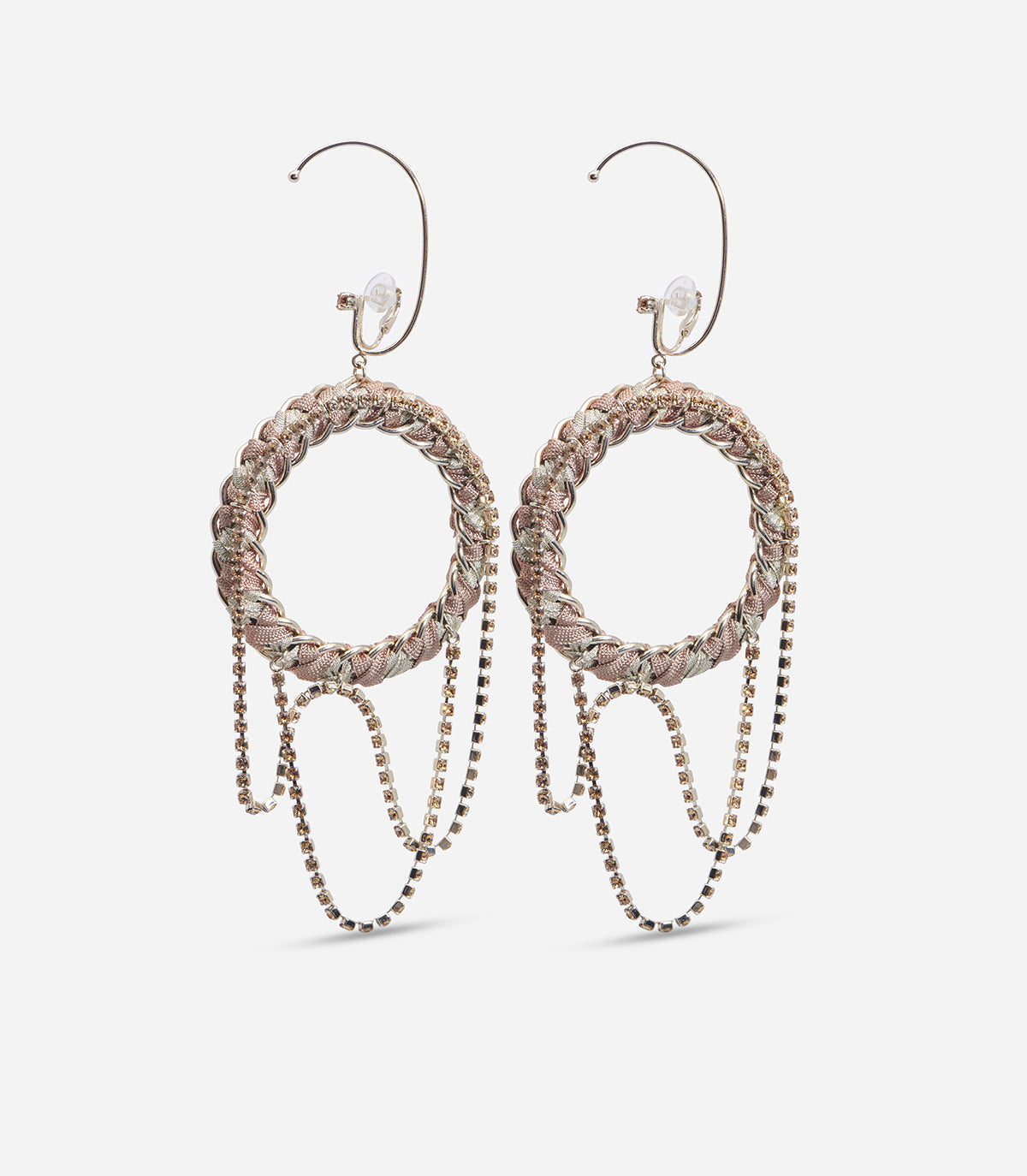 Boucles d'oreilles chaine et rubans tressés ornées d'une chaine strassée en forme de vagues pour oreilles non percées.
