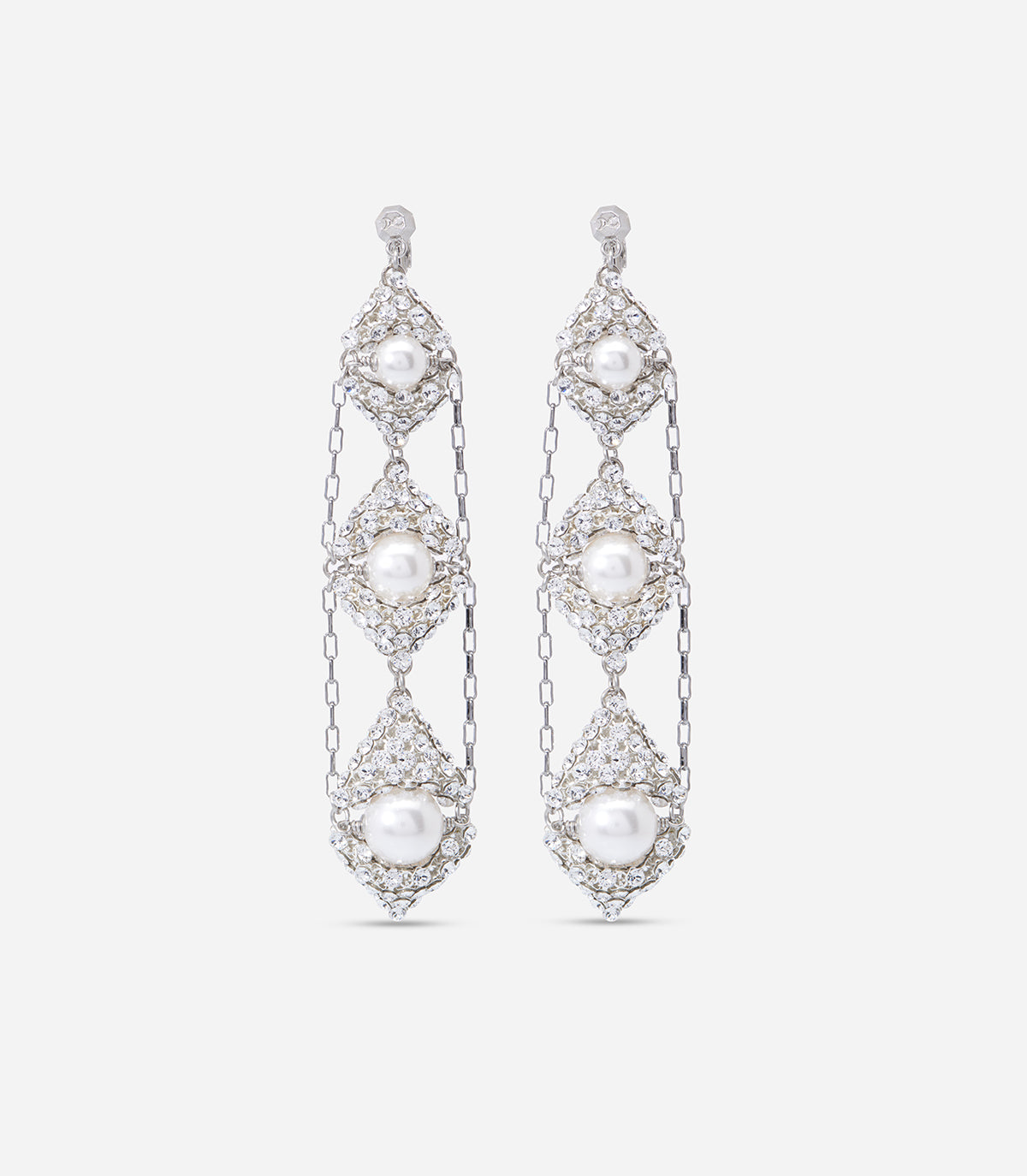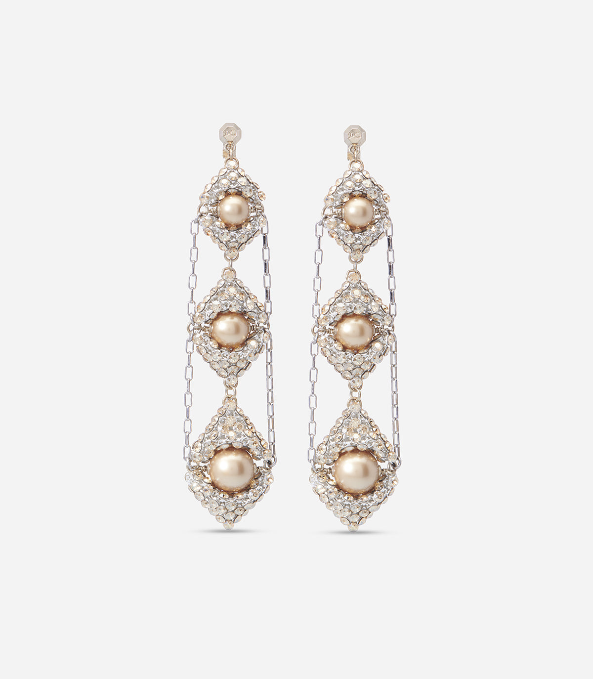 Boucles d'oreilles trois motifs losange ornés de perles entourées de maille strassée pour oreilles percées.