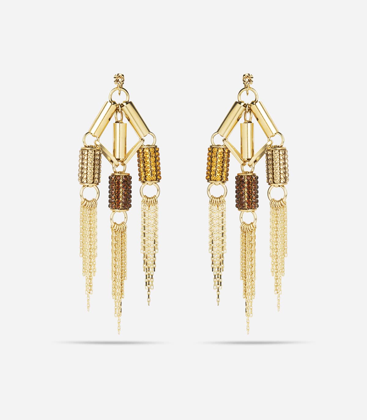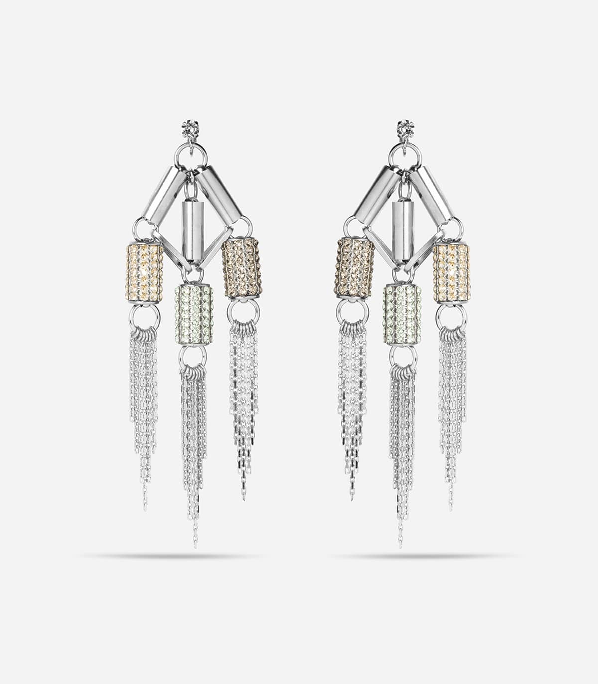 Grosses boucles d'oreilles composées de maillons, de trois motifs tubes strassés et de chaines pendantes, pour oreilles non percées (fermeture par clip).