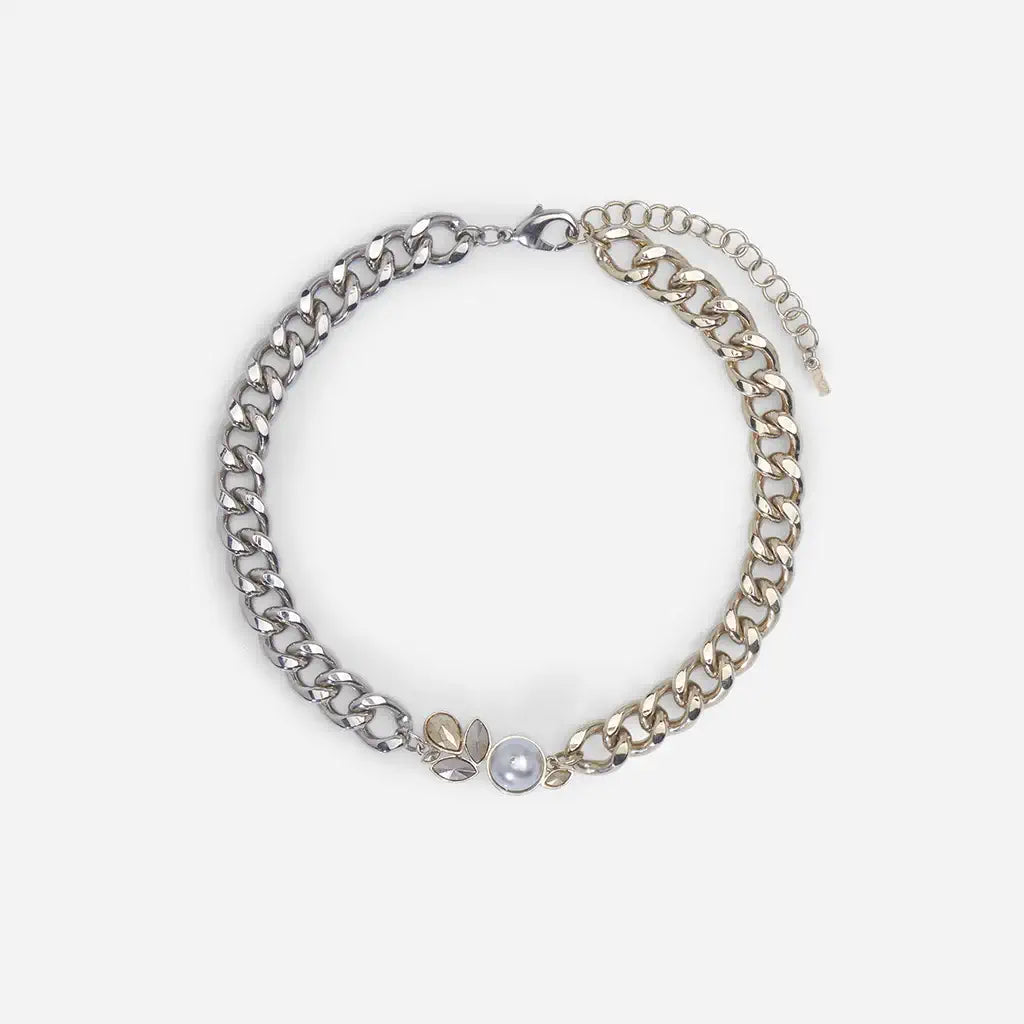 Un homme portant deux colliers : un collier Fleur Chloé argenté et doré brillant avec perle grise, et un autre collier.
