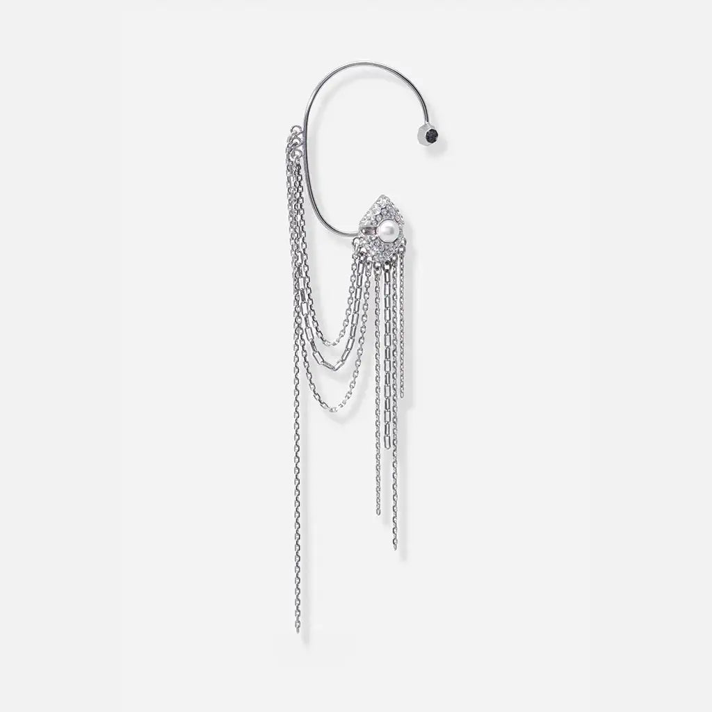 Boucle d’oreille Serpent N26 en métal satiné argenté, ornée de strass noirs, enroulée autour de l’oreille, graphique.