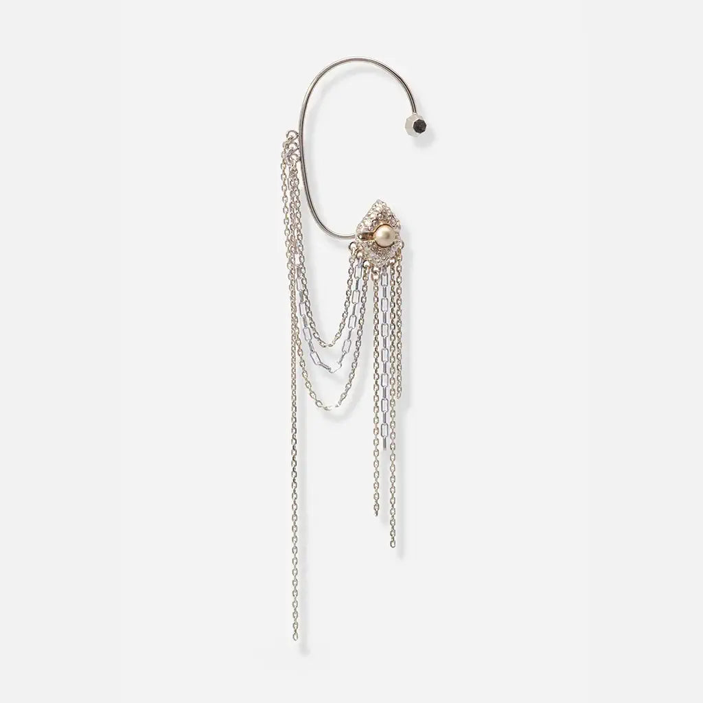 La grande broche Hortensia en métal argenté associe un motif strassé inspiré des pétales à des chaînes tombant en cascade.