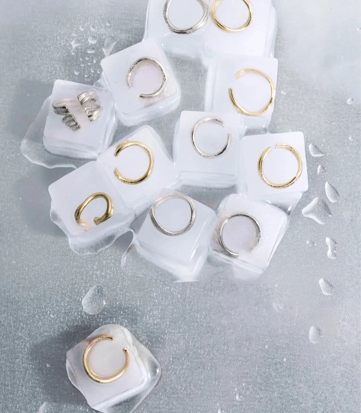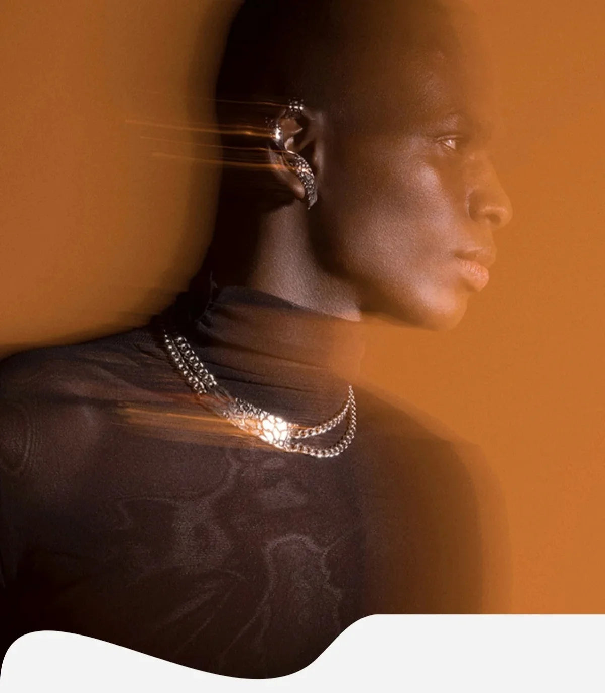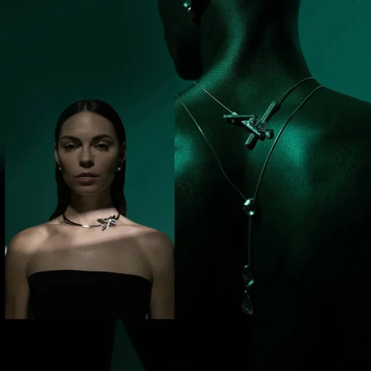 The collection's atmosphere is imbued with this fluidity: blurry plays, diffused lights, deep palettes of blues, greens, and bursts of orange, like shifting reflections on a watery surface. The jewelry shines with a silvery, almost liquid sheen, capturing the moment while transforming it.