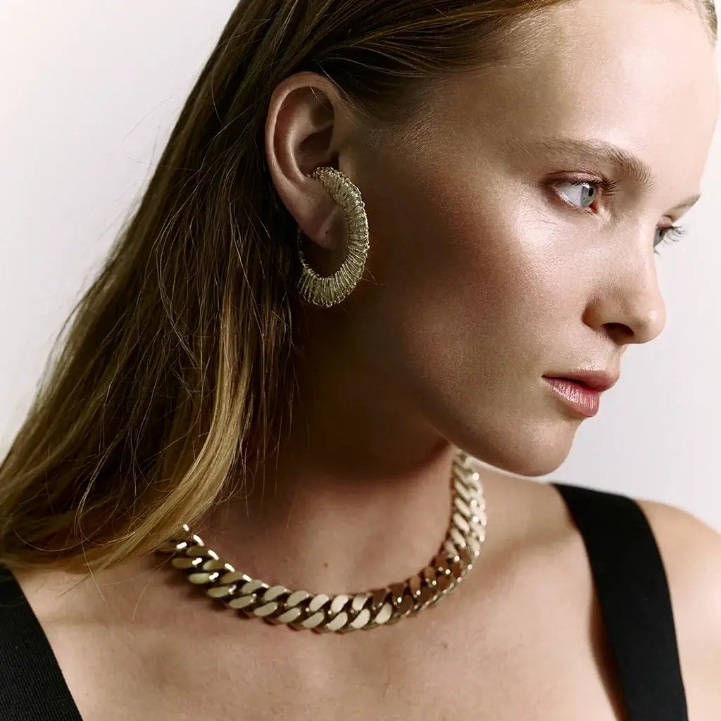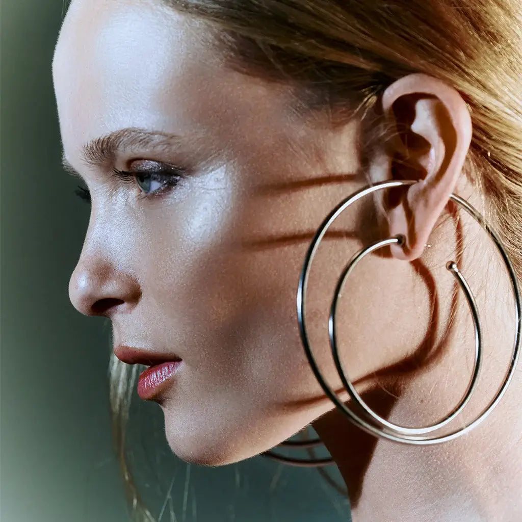 Set of four hoop earrings: for each ear, one hoop slips into the ear crease without the need for a piercing, while the other sits on the lobe like a classic earring, creating a graphic and avant-garde look, perfect for playing with contrasts.